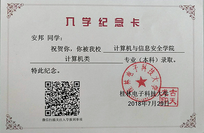 ——記好孩子學(xué)校優(yōu)秀畢業(yè)生安邦被桂林電子科技大學(xué)錄取