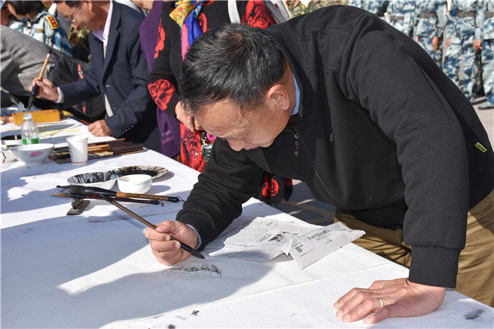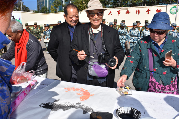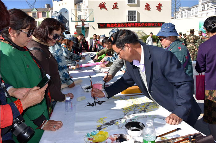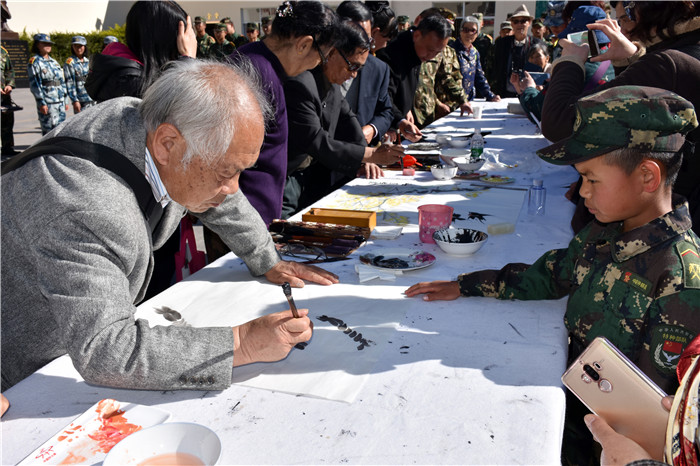緊接著,聽說老領(lǐng)導們都身懷絕技,在繪畫、書法上都頗有造詣,孩子們豈能錯過這樣的好機會。在領(lǐng)導們觀看教學片時,孩子們早早就把筆墨紙硯準備好,列隊等著請教學習。領(lǐng)導們觀看結(jié)束,一出教學樓就看著齊排排的學生圍在書法桌周圍等待他們,也不禁興致勃勃想檢驗下孩子們的日常所學。
