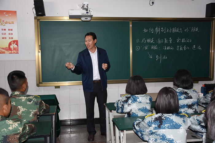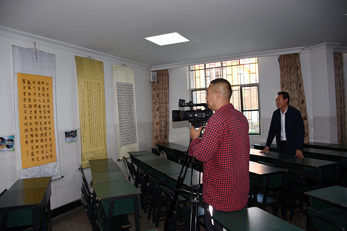杜記者一行邊走邊看邊拍,從辦公樓到教學樓、從食堂到宿舍、從操場到教室,全方位、多角度地拍攝,無不被學校獨具特色的辦學模式、精細化的教學管理、精彩紛呈的德育活動、濃厚溫馨的育人氛圍和豐碩的教學成果所打動。走到心理輔導室門口,看著心理輔導老師在給學生做“一對一”心理輔導,杜記者在不打擾的情況下進行拍攝,并在另一間心理輔導的沙盤面前停留很久。與此同時,魯校長也悄悄走到教室,查看孩子們的學習情況。不看還好,一看卻再也忍不住腳步,情不自禁走進去和孩子們親切交談,語重心長地聊起了“如何辨別好朋友與壞朋友”,孩子們紛紛爭相發(fā)言,表明觀點,大聲說出好朋友就是積極的、可愛的、身心健康的、能共同成長的、有正能量的等觀點,看著孩子的成長,魯校長甚是欣慰,或許這就是刻在骨子里的教育情節(jié)。這一畫面,也被杜記者默默記錄。