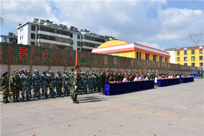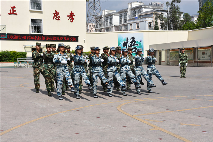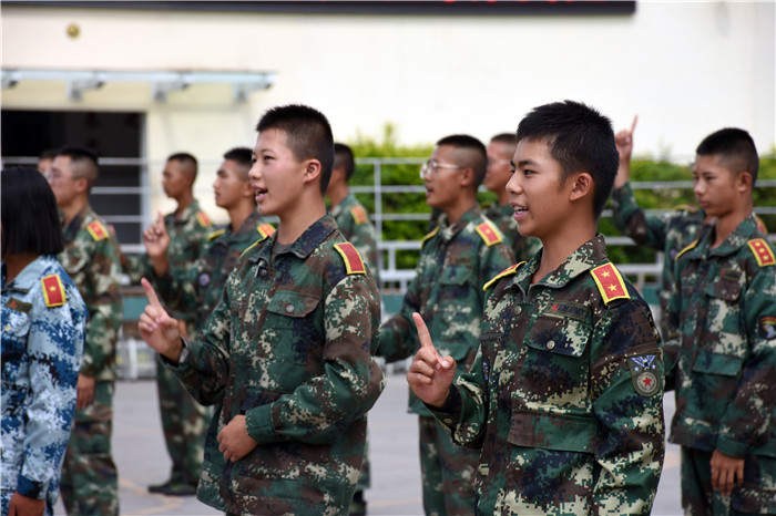 參觀結束,全體人員在操場集合。國旗手英姿颯爽、精神抖擻地入場,進行了莊嚴的升國旗儀式,師生們軍容嚴整,行著標準的軍禮注視著五星紅旗冉冉升起。隨后,軍事匯報表演在迎校旗中拉開序幕。