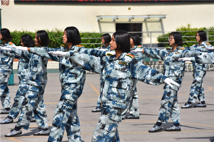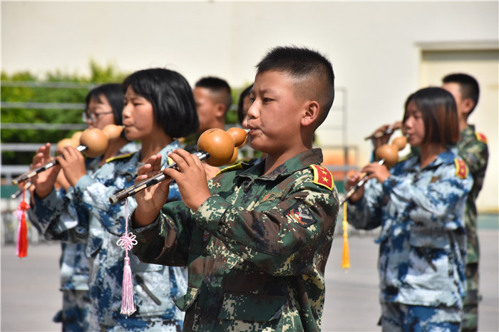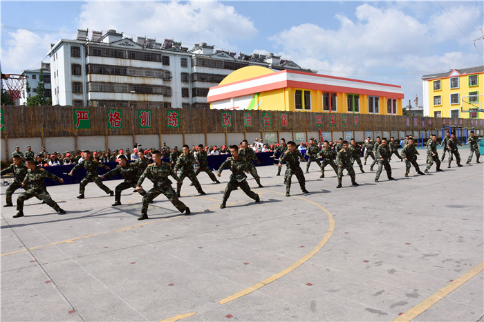 在教官的帶領下,我校男女生隊列、軍體拳、匕首操、葫蘆絲合奏《荷塘月色》、《女兵操》、手語《我相信》等方隊相繼出場。隊列方隊的同學們精神飽滿、口號響亮、步伐鏗鏘、隊形整齊,展現(xiàn)了良好的精神風貌;軍體拳方隊的表演也深深吸引了大家的眼球,出拳帶風,出腿起塵,踢腳勾拳,嫻熟連貫,帥氣瀟灑,被同學們演繹得淋漓盡致;匕首操方隊的同學們也毫不遜色,一招一式,一起一落,剛勁有力,展現(xiàn)了頑強拼搏和勇做時代弄潮兒的決心;葫蘆絲合奏的《荷塘月色》,清幽典雅,跟著旋律有如身臨其境,仿佛有種荷塘晚風吹拂的清涼,一幅夏日荷塘月色的動人畫卷頓時呈現(xiàn)在大家眼前,也傳遞出孩子們對淡雅事物的美好追求;《女兵操》表演剛柔并濟,歡快向上,展示出孩子們的健康與活力。