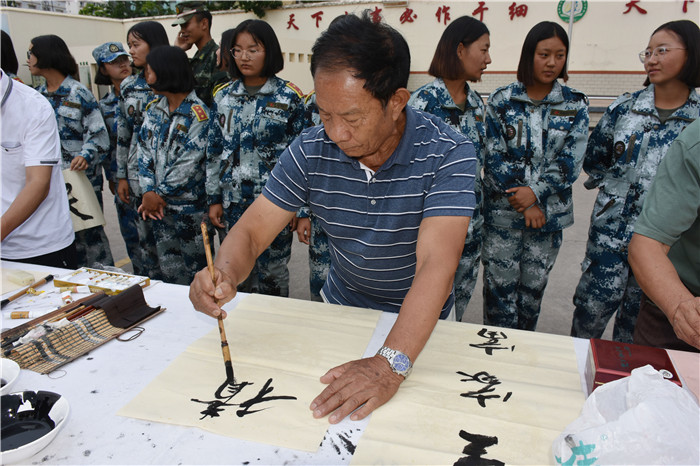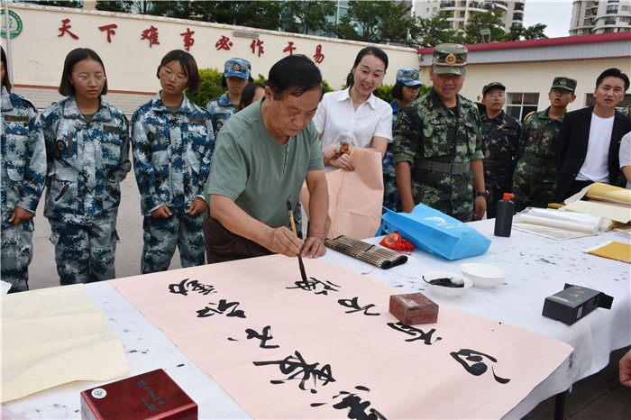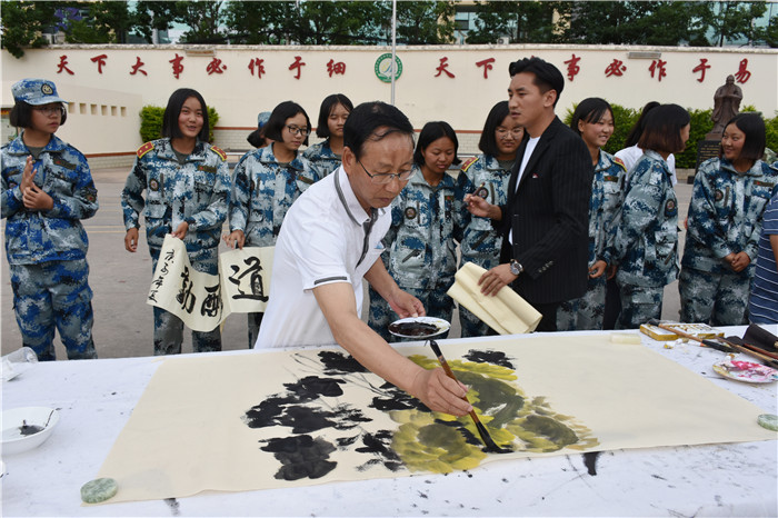 聯誼匯演結束,聽說老領導們都身懷絕技,在繪畫、書法上都頗有造詣,孩子們豈能錯過這樣的好機會,迫不及待地與老師一起把筆墨紙硯準備好,列隊等著觀摩學習。李主任、“五老”鄧成列、徐繼泉等領導不辭辛勞,現場毫不吝嗇地揮毫潑墨,只見筆墨飛舞間,一幅幅遒勁有力、氣勢非凡的的書法作品和活靈活現的《向日葵》水墨畫躍然紙上,呈現在大家眼前,令人賞心悅目,師生們贊不絕口,力量倍增。