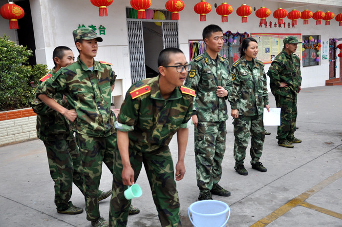 上午,學(xué)校副校長兼總教官毛積敏、副總教官王濤組織學(xué)生開展班級“運水接力賽”活動,規(guī)則是各班同學(xué)在相同的時間內(nèi)攜帶負(fù)重物接力跑,并且要把對面桶里的水快速用杯子運送到自己班的水桶里。一聲哨響,比賽開始了,同學(xué)們用最快的速度來回運輸,各班都配合默契,最終比賽得分相差甚少。勝出的班級獲得了“戰(zhàn)利品”,臉上掛滿了笑容,開心的與其他同學(xué)分享著自己的喜悅。