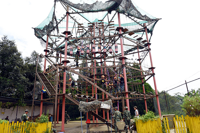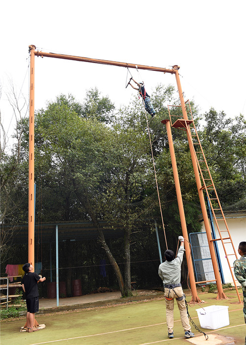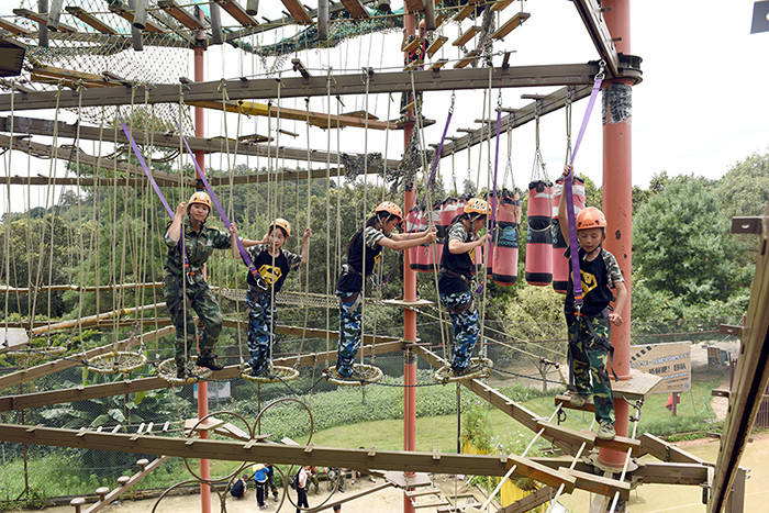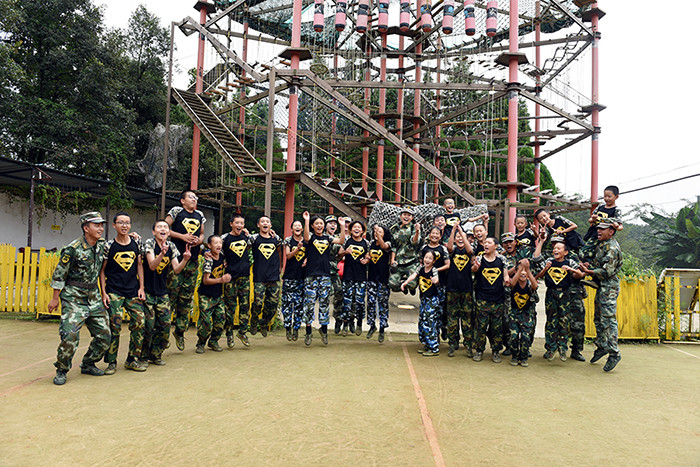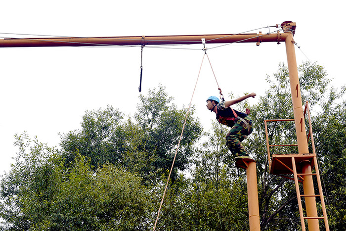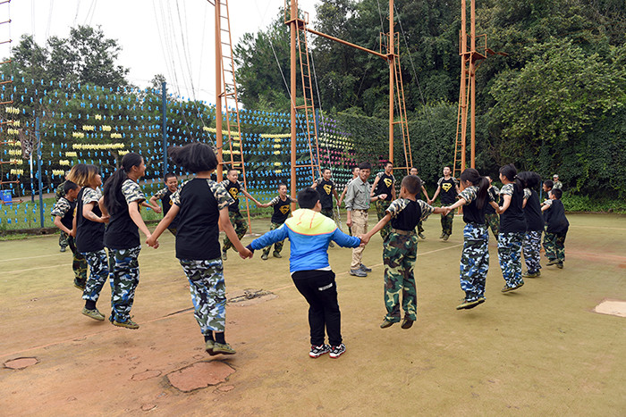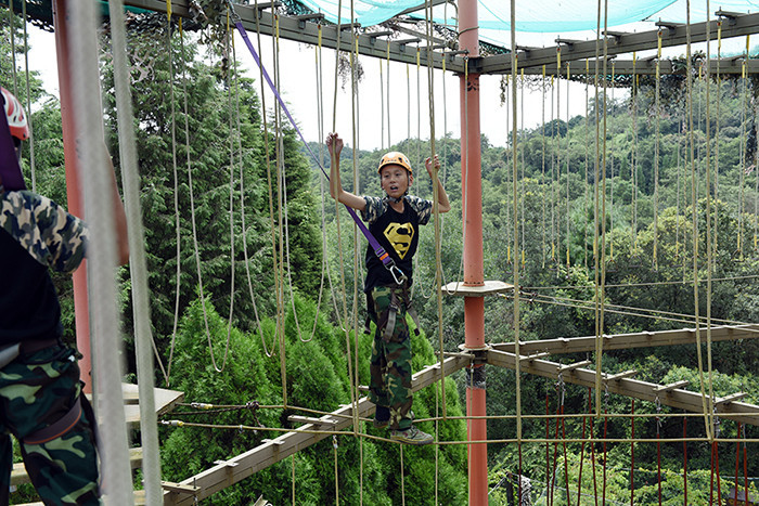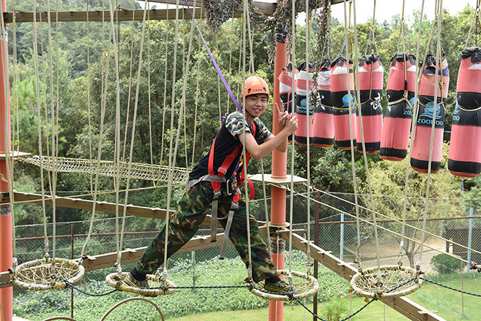 拓展活動(dòng)在教練們的耐心講解和簡(jiǎn)短的“戰(zhàn)前”熱身運(yùn)動(dòng)中拉開(kāi)了帷幕。孩子們分成兩隊(duì)比拼,在各隊(duì)隊(duì)長(zhǎng)的帶領(lǐng)下,分別組成了“紅軍隊(duì)”與“戰(zhàn)狼隊(duì)”,相應(yīng)口號(hào)也立即產(chǎn)生,伴隨了各隊(duì)振奮人心、催人奮進(jìn)的口號(hào)和加油聲,同學(xué)們陸續(xù)挑戰(zhàn)了巨人梯、空中抓杠、探險(xiǎn)樂(lè)園等30余個(gè)項(xiàng)目。