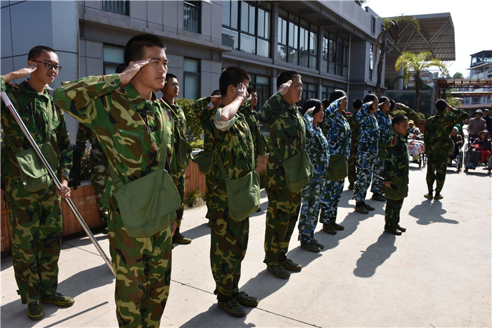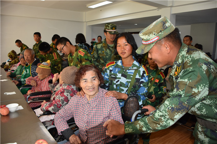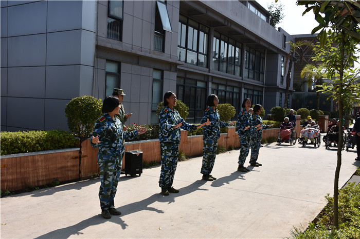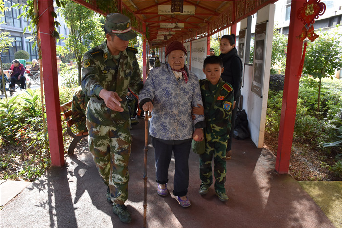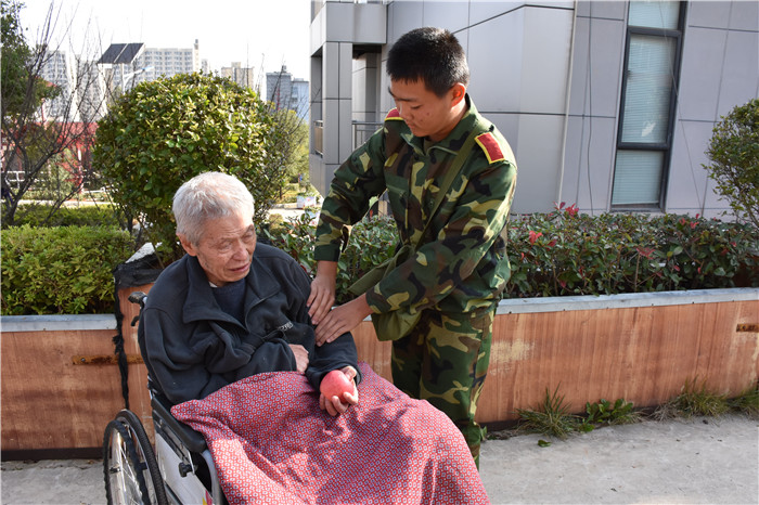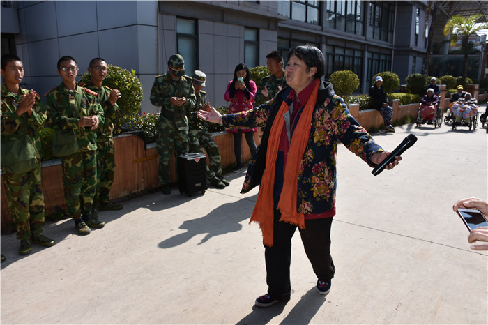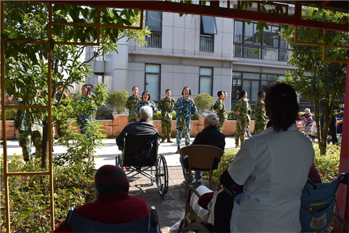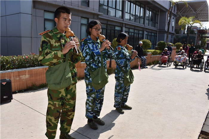 到了敬老院同學(xué)們立馬給老人們送上了蘋果,還主動到老人身邊扶著老人散步、推著輪椅陪老人看風(fēng)景、陪老人們聊天、給老人們按摩,一張張稚嫩的笑臉和一雙雙慈祥的目光碰撞出“家”一樣的和諧、溫馨。聽說老人們喜歡看表演,孩子們就為老人們唱起了軍歌、表演了軍體拳、跳手語舞、演奏葫蘆絲等。豐富的節(jié)目博得了老人們的好評,掌聲不斷響起,幾位老奶奶也開心地送上了自己的拿手表演,整個(gè)院兒里充滿了掌聲和歡笑聲。