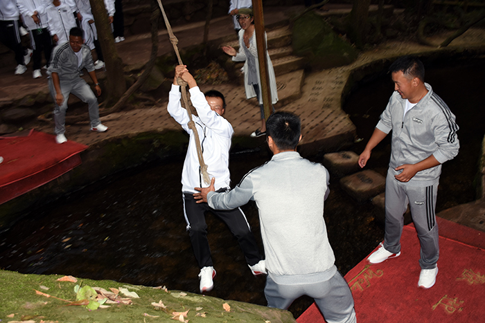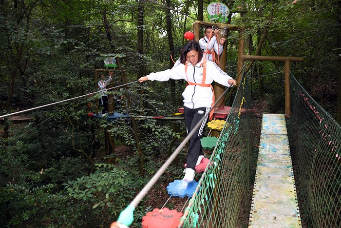在老師們的帶領(lǐng)下,大家沿著山間的石板路,首先到達(dá)了第一個(gè)項(xiàng)目挑戰(zhàn)點(diǎn)——水上蕩繩(也叫笑料陷阱),孩子們?cè)诶蠋煹哪托闹v解和示范后,相繼進(jìn)行了挑戰(zhàn)。有的身輕如燕,一躍而過(guò);有的驚險(xiǎn)蕩過(guò),虛驚一場(chǎng);有的蜻蜓點(diǎn)水,老師巧妙護(hù)住。孩子們玩得不亦樂(lè)乎,久久不肯離去。隨后,孩子們?cè)凇皪{谷森林最美拓展大本營(yíng)”又開(kāi)始了一系列的高空挑戰(zhàn)項(xiàng)目,體驗(yàn)了這條“最美森林冒險(xiǎn)之旅”的花籃跳、折疊橋、葵花笑、半月橋、時(shí)光隧道、鐵索連環(huán)、生命之門、單側(cè)過(guò)網(wǎng)等30個(gè)驚險(xiǎn)刺激關(guān)卡。腳下是清澈的山澗溪流,身旁是彩蝶翩躚,藤蔓纏繞,置身這仙境般般的大自然,孩子們的笑聲格外清脆。