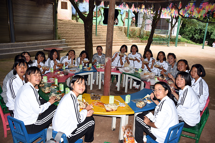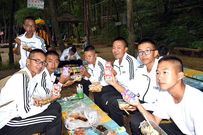 很快到了午餐時(shí)間,老師們把早早就精心準(zhǔn)備好的各種美食(涼卷粉、海帶絲、糕點(diǎn)、飲料等)分發(fā)到每一位孩子手中。雖然一早的挑戰(zhàn)項(xiàng)目讓大家有了些許疲憊,但在美食面前,在涼爽的綠蔭下,孩子們一個(gè)個(gè)像小饞貓一樣開(kāi)心地吃起來(lái),所有的勞累頓時(shí)煙消云散。
