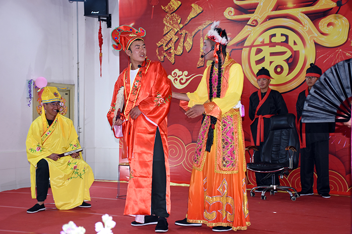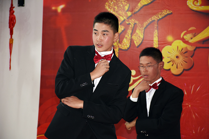 七班獻(xiàn)上的小品《四大才子》,更是把現(xiàn)場氣氛一次次推向高潮!八拇蟛抛印绷芾毂M致、幽默風(fēng)趣地演繹了各自經(jīng)過海選,憑借其詩詞歌賦才子氣質(zhì),獲得文府的招親資格,但因文府大小姐其貌不揚(yáng),才子們一波三折后卻誰都不想招親成功的搞笑情景,讓觀眾捧腹大笑,雷鳴般的掌聲不時(shí)響起。