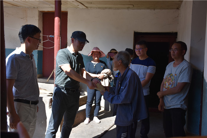 捐贈結(jié)束,盡管天氣特別炎熱,氣溫高達39攝氏度,但大家顧不上休息,在村主任的帶領下,頂著高溫徒步來到細柞村,走訪看望貧困戶,每到一戶,師生們都與其促膝談心,噓寒問暖,詳細了解他們的家庭收入、生活住房情況等,同時給貧困戶送去衣物和捐款。受贈的樸實老人接過沉甸甸的捐贈款,感動不已,倍感溫暖。