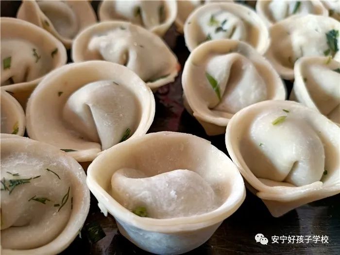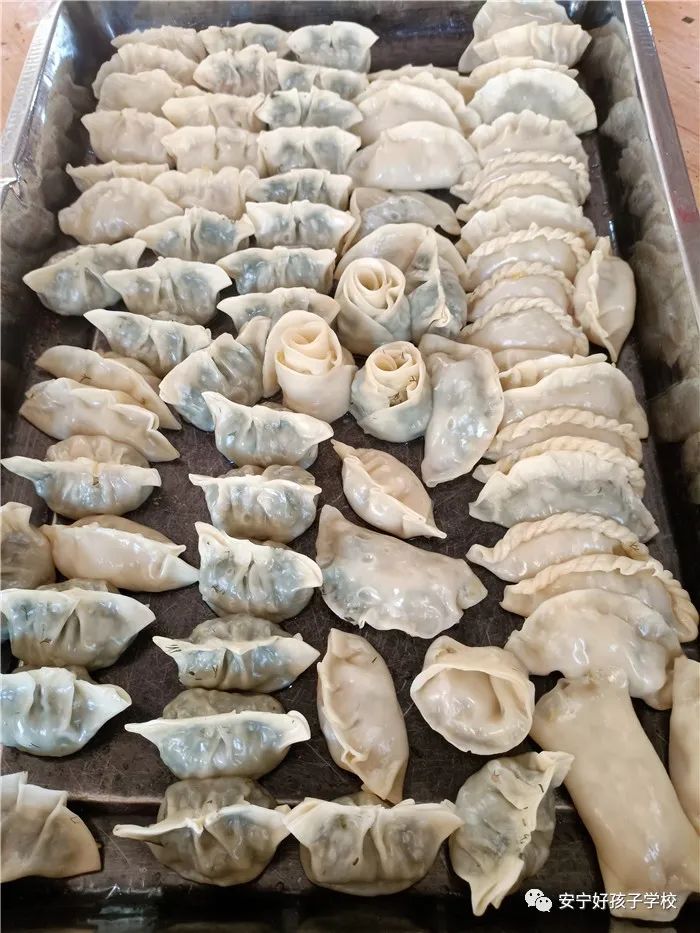 孩子們包出來的餃子花樣繁多、千姿百態(tài),有敦實厚重的,有別致精巧的,還有四不像的?粗槐P盤別出心裁但都裹滿愛意的餃子,看著一張張掛滿面粉但都笑容燦爛的面容,吃著香溢滿口的餃子,別樣的新春喜慶連連。