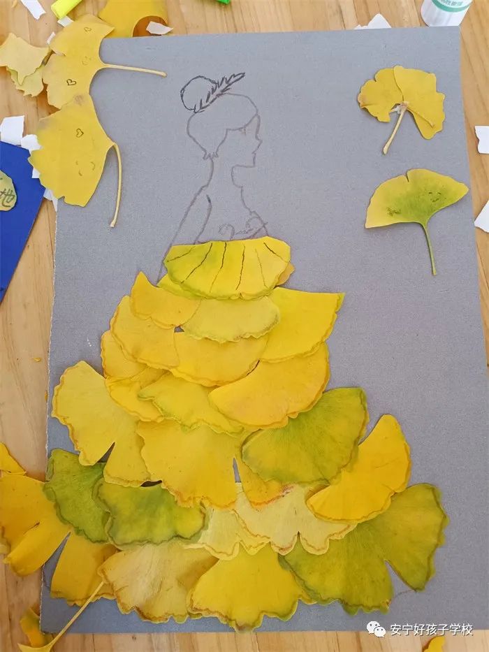 活動中,師生們熱情高漲,全身心投入制作。通過壓平、粘貼、晾干等方法,巧妙地利用不同顏色和形狀的樹葉,或是平鋪制圖,或是層層疊加,在卡片上繪制圖案。很快,一片片不起眼的葉子,經(jīng)過一雙雙巧手的精心雕琢,便成了一件件栩栩如生的藝術(shù)品,有舞者、公主裙、圣誕樹、花朵等銀杏畫,有的孩子還在葉子上寫下了滿滿的祝福和對未來的憧憬。一片片銀杏葉頓時像被賦予了生命一樣,鮮活起來。