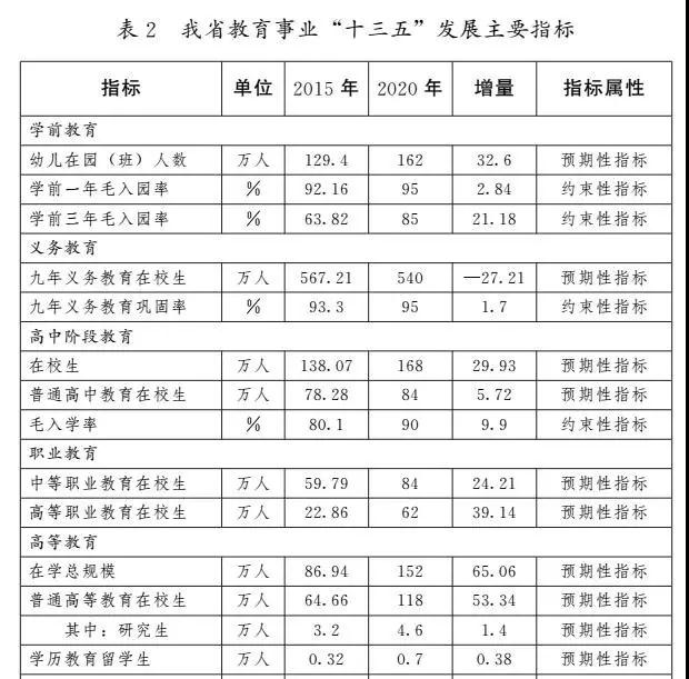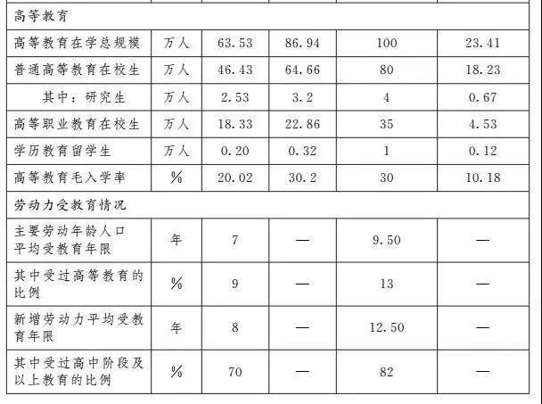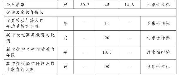 到2020年,基本普及學(xué)前教育,學(xué)前一年毛入園率達95%,學(xué)前三年毛入園率達85%以上;完成義務(wù)教育均衡發(fā)展目標,129個縣、市、區(qū)全部實現(xiàn)縣域內(nèi)義務(wù)教育基本均衡發(fā)展,九年義務(wù)教育鞏固率達95%;普及高中階段教育,高中階段教育毛入學(xué)率達90%以上,普通高中和中等職業(yè)教育協(xié)調(diào)發(fā)展;基本建成中等、高等職業(yè)教育相互銜接貫通的現(xiàn)代職業(yè)教育體系,中等職業(yè)學(xué)校和普通高中招生規(guī)模大體相當(dāng);擴大高等教育規(guī)模,高等教育毛入學(xué)率達45%以上;暢通繼續(xù)教育、終身學(xué)習(xí)通道,基本建成靈活開放的終身教育體系。主要勞動年齡人口平均受教育年限達到11年,其中受過高等教育的比例達20%,新增勞動力平均受教育年限達到13.5年,其中受過高中階段及以上教育的比例達90%左右。