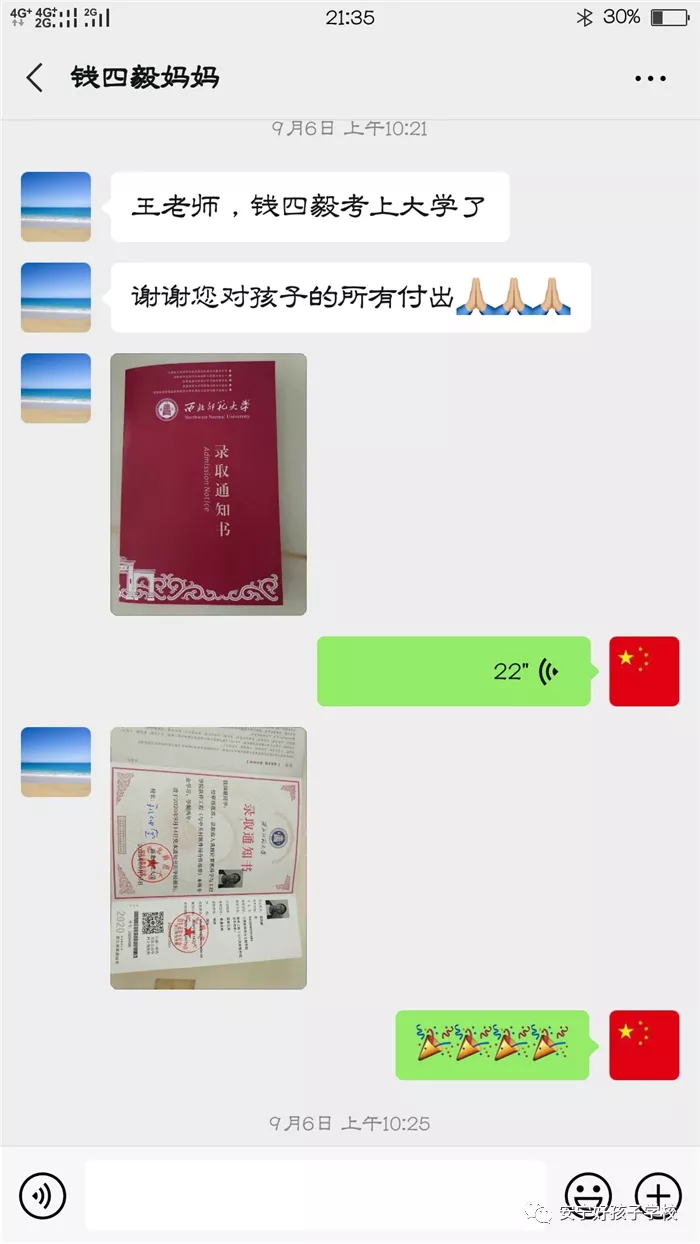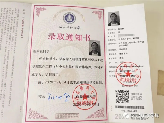 的確,經(jīng)過好孩子學校10個月的學習,曾經(jīng)少不更事的錢四毅陽光了、自信了、長大了、懂事了!不但懂得了父母的艱辛與無私的愛,還回歸學校繼續(xù)就讀,憑借超乎常人的堅韌和頑強,深夜挑燈,寒窗苦讀,查缺補漏,迅速追趕,最終考上自己理想的大學。