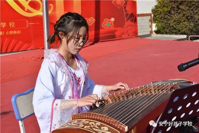 二班獨(dú)奏的古箏《芒種》,盡顯悠揚(yáng)婉轉(zhuǎn),在動(dòng)人的旋律中,我們既看到了孩子扎實(shí)的演奏技巧,也更直接、生動(dòng)地感受到了她“彈情非彈琴”的意境和古箏的藝術(shù)魅力。同時(shí)也讓我們感受到了農(nóng)民伯伯的艱辛和歡愉,一幅忙碌的耕種圖躍然眼前。而在舞臺(tái)的另一側(cè),孩子們卻用日常所學(xué),專(zhuān)心致志地現(xiàn)場(chǎng)書(shū)寫(xiě)春聯(lián),琴聲結(jié)束,書(shū)寫(xiě)也相繼完畢,配合十分默契。