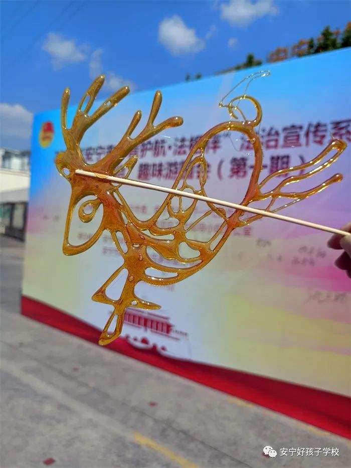 在每個(gè)游戲中,同學(xué)們都努力集齊“青護(hù)航,法相伴”六個(gè)字,完成游戲打卡的同學(xué),歡天喜地的到禮品兌換點(diǎn)兌換甜蜜糖畫,一時(shí)間,兌換點(diǎn)的糖人泥人供不應(yīng)求。大家一邊吃著糖人,一邊在簽名墻上留下自己的名字。“糖畫甜在唇間,知識記在心里”!吨腥A人民共和國預(yù)防未成年人犯罪法》、《中華人民共和國未成年人保護(hù)法》等相關(guān)法律法規(guī)貫穿游戲始終,同學(xué)們在玩中學(xué),在學(xué)中樂,無形中強(qiáng)化了同學(xué)們的法律意識,增強(qiáng)了法治觀念。