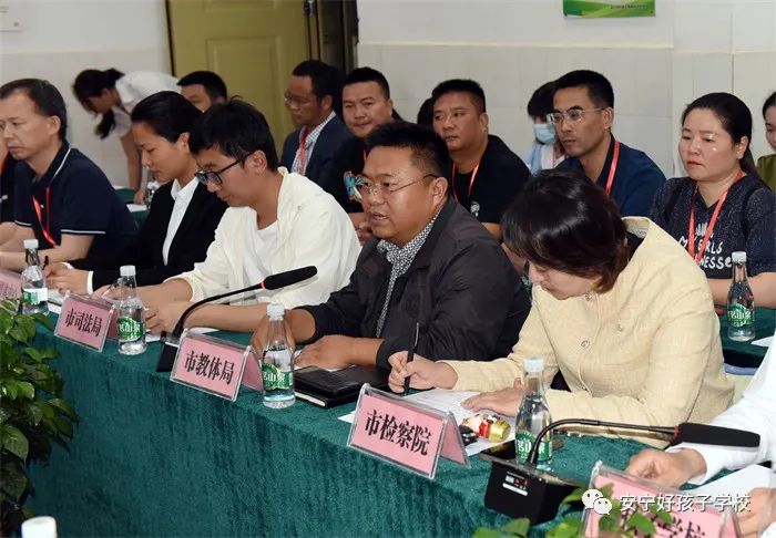 緊接著,召開了座談會(huì)。座談會(huì)伊始,魯校長介紹了出席領(lǐng)導(dǎo)。隨后,安寧市教育體育局副局長潘健致歡迎辭,并向領(lǐng)導(dǎo)們報(bào)告了安寧市的歷史沿革和全市教育事業(yè)發(fā)展的情況以及取得的各項(xiàng)成績。隨后,安寧市人民檢察院派駐溫泉檢察室主任孫曉宇向領(lǐng)導(dǎo)們作了安寧市預(yù)防青少年違法犯罪工作經(jīng)驗(yàn)報(bào)告。孫主任說道:“安寧既是全國文明城市,也是云南省唯一一家預(yù)防未成年人犯罪全覆蓋的地方。安寧市竭力打造社會(huì)、社工、社區(qū)‘三社’聯(lián)動(dòng)的預(yù)防模式,把完善預(yù)防體系建設(shè)作為提升社會(huì)治理現(xiàn)代化的重要途徑。前端,有好孩子學(xué)校作為臨界預(yù)防和社會(huì)觀護(hù)的重要陣地;后端,把駐省未管所刑罰執(zhí)行監(jiān)督,作為教育改造涉罪未成年人、預(yù)防再犯的重要抓手,一體化推進(jìn)未病先防、既病防變、疾后防復(fù),探索出了具有安寧特色的預(yù)防未成年人違法犯罪工作新格局。而且引入國有化社會(huì)資源,幫助其就業(yè),預(yù)防再犯。尤其是聯(lián)合教體、公安著力打造的‘靈雨之光’工作室,有力幫助了公安一站式取證和受害人的心理康復(fù)。此外,還聯(lián)合公安開展教職工入職查詢,對(duì)老師品德進(jìn)行前期考察,織密校園安全防護(hù)網(wǎng)。”