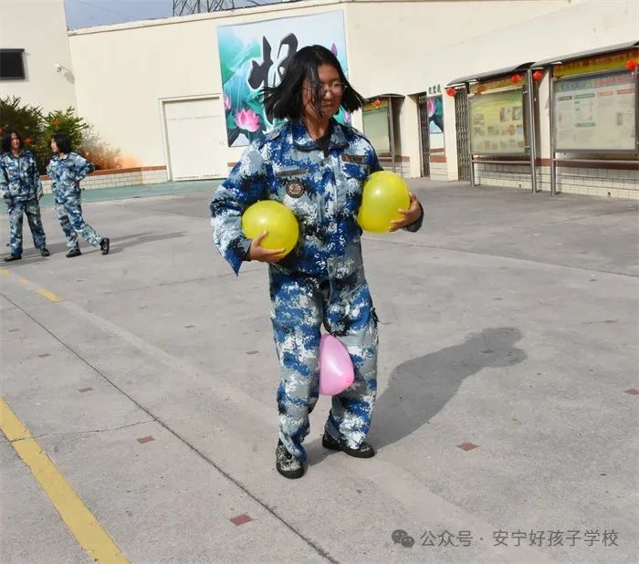“太空漫步”每組8名成員參與,參賽者腋下夾兩個氣球,腿上夾一個氣球,將氣球運到終點傳遞給下一名隊員,最終8人走完,用時最短的小組取勝。