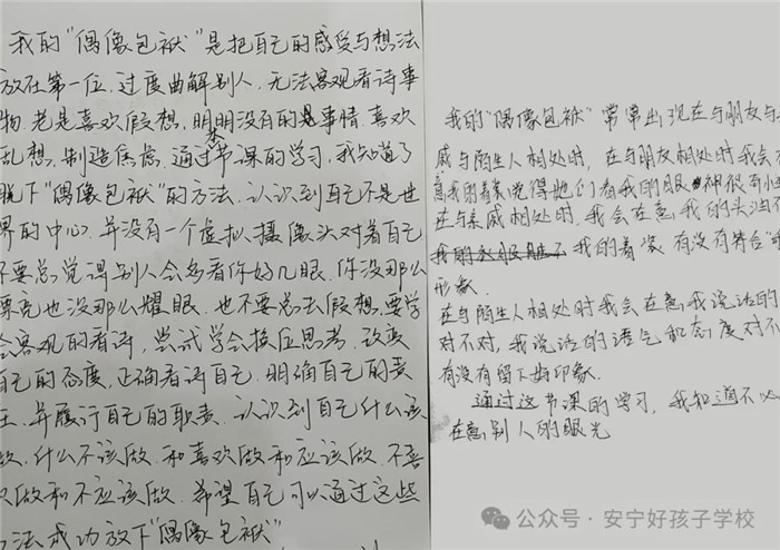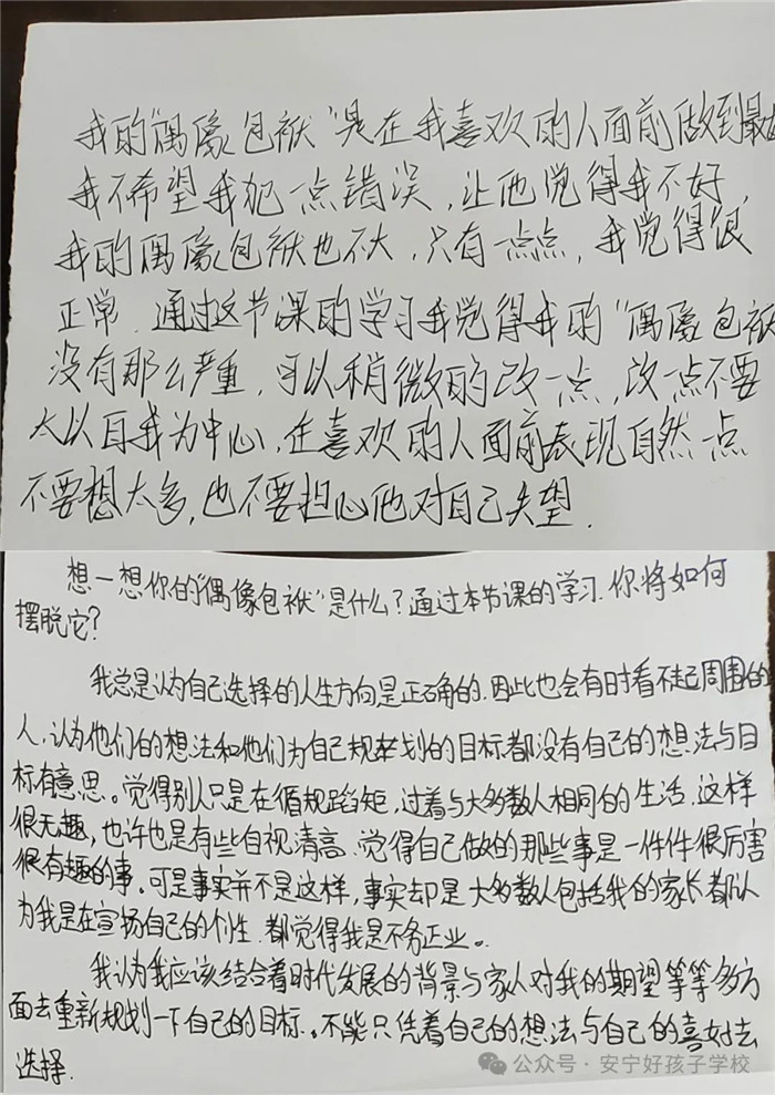 最后,在“我的偶像包袱”課程作業(yè)中也體現(xiàn)出了孩子們的收獲。有的孩子為自己以前總要求父母、朋友圍著自己轉(zhuǎn),把他們的好當(dāng)做理所當(dāng)然而感到后悔,表示以后會盡量學(xué)著“己所不欲,勿施于人”;有的孩子想起自己以前太過在意別人的看法與議論,非常在意形象,浪費(fèi)了很多的時(shí)間,現(xiàn)在會嘗試著把更多的精力和時(shí)間放在自己該做的事情上;還有的孩子發(fā)現(xiàn)自己總會把自己的缺點(diǎn)和別人的優(yōu)點(diǎn)做對比,把自己放在了很低的位置,而通過本節(jié)課的學(xué)習(xí),發(fā)現(xiàn)了自己也有很多優(yōu)點(diǎn),對自己的認(rèn)識更進(jìn)一步。
