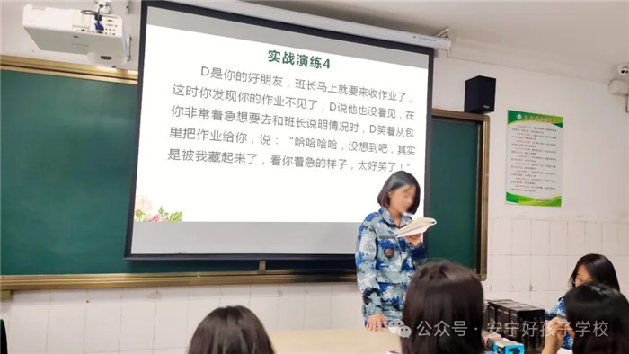 緊接著,張老師首先讓孩子們理解“和而不同”的內(nèi)涵,讓孩子們明白在人與人的相處中,既應(yīng)當尊重他人的需求與愿望,同時也要堅守個人的界限與原則,清晰界定個人的能力范圍與心理舒適區(qū),避免過度犧牲自我導(dǎo)致的疲憊與不滿。然后通過“如何在拒絕中實踐‘和而不同’案例”,給孩子們傳授了“拒絕寶典”的精髓。