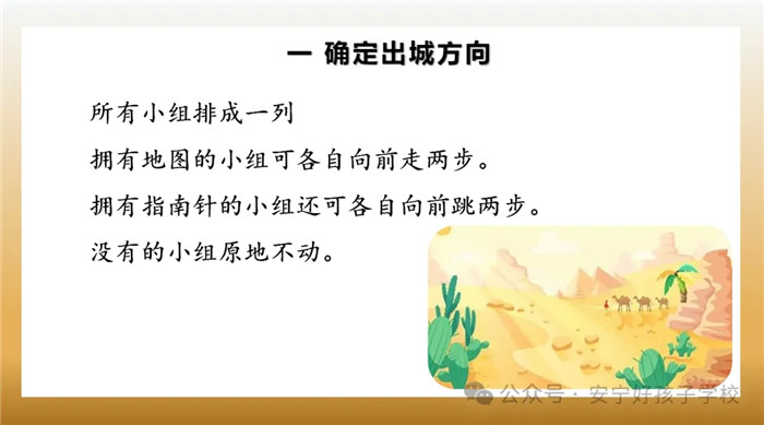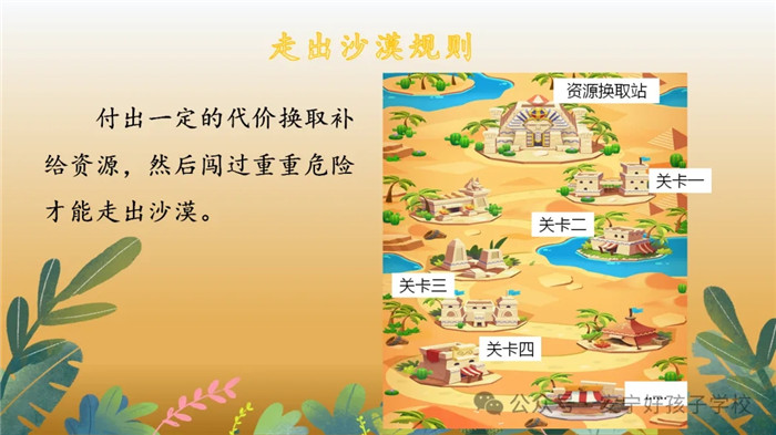 本次課程以“沙漠冒險”為背景,邀請孩子們進行了一次“沙漠大求生”,為了和小組成員一起走出“沙漠”,每個成員都要選擇犧牲一些東西來換取“物資”,以便在最后的“逃生”環(huán)節(jié)獲得便利。