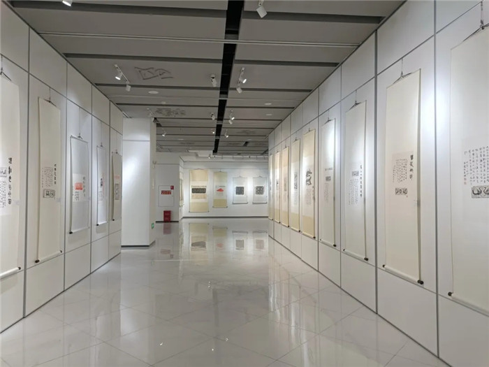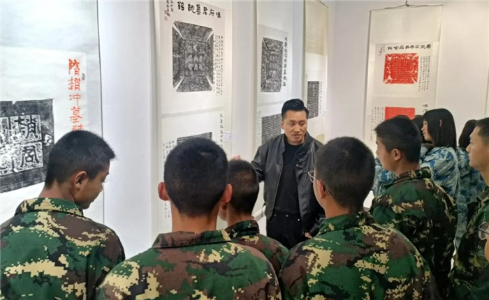 本次展覽,由安寧市書(shū)法家協(xié)會(huì)名譽(yù)主席李文潔、安寧市書(shū)法家協(xié)會(huì)主席李艷東(我校書(shū)法教師)兩位書(shū)法家將各自收藏多年的金石拓片進(jìn)行了題跋創(chuàng)作,共遴選出120余幅金石題跋珍品進(jìn)行展出,形式多樣,涉及面廣,涵蓋了經(jīng)典碑帖、唐人墓志、秦磚漢瓦、銅鏡銘文、殘石畫(huà)像等門(mén)類(lèi)。書(shū)法教師李艷東現(xiàn)場(chǎng)解析展品中書(shū)體演變脈絡(luò),結(jié)合《唐崔賁墓志銘》《裴敬墓志》等經(jīng)典碑帖,闡釋“透過(guò)刀鋒看筆鋒”的臨摹要義。