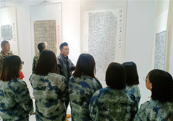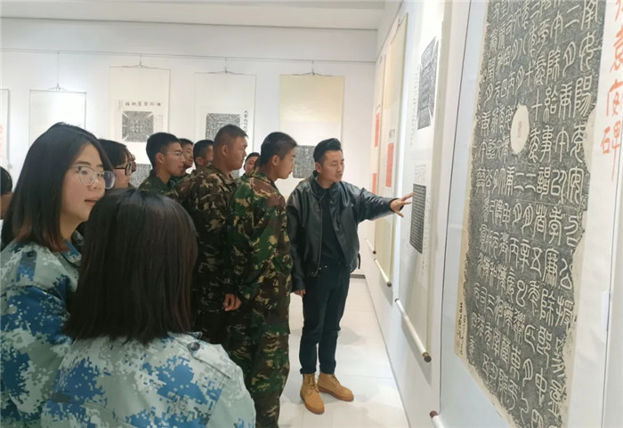 展覽突破傳統(tǒng)范式,兩位書(shū)法家創(chuàng)造性運(yùn)用“拓片為經(jīng),題跋為緯”的展陳邏輯,以篆、隸、楷、行、草不同書(shū)體題寫(xiě)跋文,既有魏碑雄強(qiáng)筆勢(shì)與粗獷拓痕的張力碰撞,也不乏娟秀小楷與細(xì)膩紋飾的和諧共生。通過(guò)章法疏密、墨色濃淡的匠心,為師生呈現(xiàn)了一場(chǎng)跨越千年的文化盛宴,讓師生在斑駁的拓片肌理間遇見(jiàn)文明密碼,于翰墨丹青間傳承文化基因,感受“一紙拓千秋”的文化魅力。