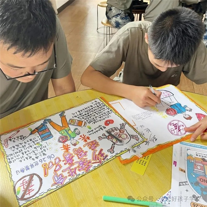 下午,一場充滿創(chuàng)意的禁毒手抄報創(chuàng)作活動在多功能室火熱開展。同學們將上午所學轉化為藝術表達,用漫畫揭露毒品騙局,用色彩描繪無毒未來。一幅幅作品構思巧妙、寓意深刻,既展現(xiàn)了同學們的藝術才華,更表達了他們對毒品堅決抵制的決心。