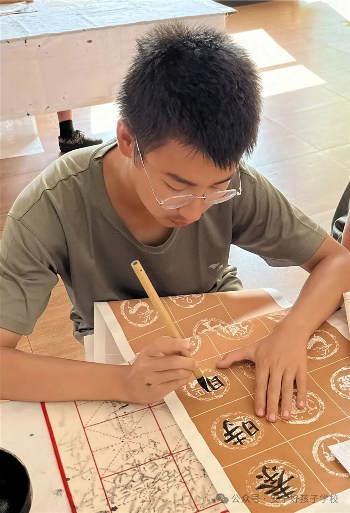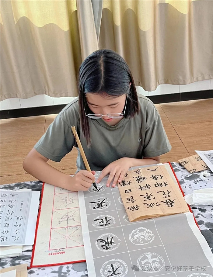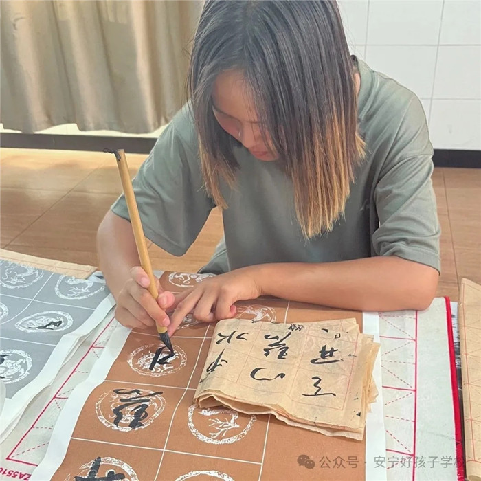 墨香在空氣中彌漫,與孩子們的專注神情相互交融。孩子們沉浸其中,忘卻了喧囂與紛擾,只專注于眼前的這一方宣紙。一筆一劃提按頓挫的完成,都是一次自我的超越,也是與古人智慧的一次碰撞與共鳴。當作品呈現(xiàn),紙上的墨痕仿佛有了生命,訴說著孩子們在書法之路上的堅持與探索,見證著孩子們的努力與成長。