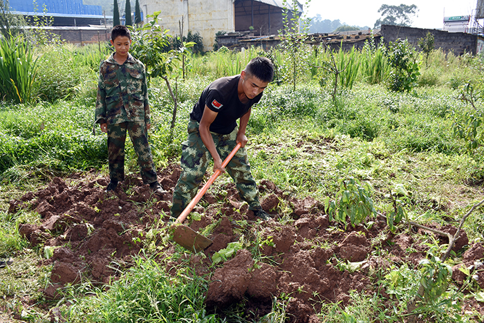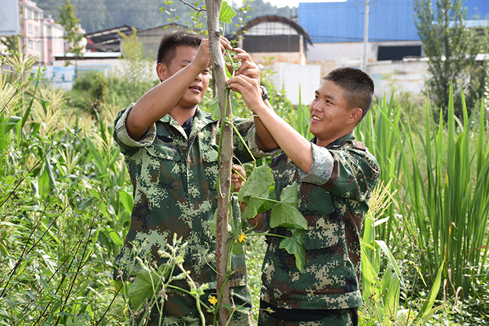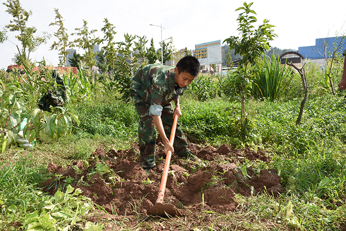 有的孩子在玉米地里調皮地吹著喇叭花,像是吹著沖鋒號,等待隊伍的集結。有的靜靜聆聽溝渠里青蛙的重奏,還不忘臨摹幾聲。有的看見蝸牛,好奇地放在手里仔細端詳。有的和老師一起,為瓜藤找一個延伸之地。有的掄起鋤頭挖地,種上下一季的希望。